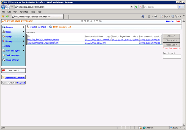 Список активных http-сессий представлен в окне "HTTP sessions list" (рис. 16). Окно можно вызвать, выбрав пункт меню "Users" -> "HTTP sessions list" в окне "OnLAN Server" (рис. 3).