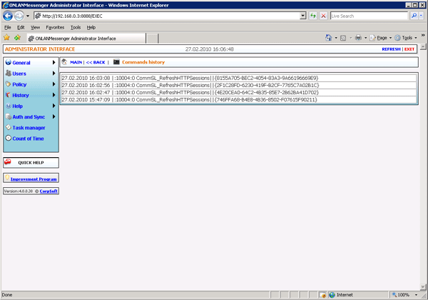 В журнале истории команд отображаются последние 100 команд, выполненных с начала текущей сессии работы сервера. Просмотреть историю можно в окне "Command history" (рис. 18), которое вызывается с помощью пункта меню "Journals and log" -> "Command history" в окне "OnLAN Server". Очистить историю команд нельзя.