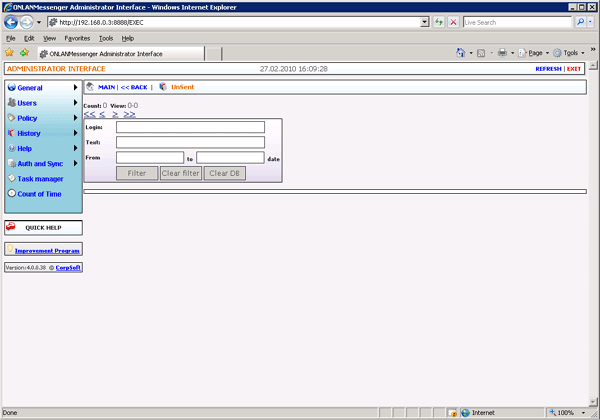 Очистить журнал не доставленных сообщений можно, либо нажав кнопку "Clear all" в окне "UnSent", либо выбрав пункт меню "Journals and log" -> "Clear Unsent" в окне "OnLAN Server".